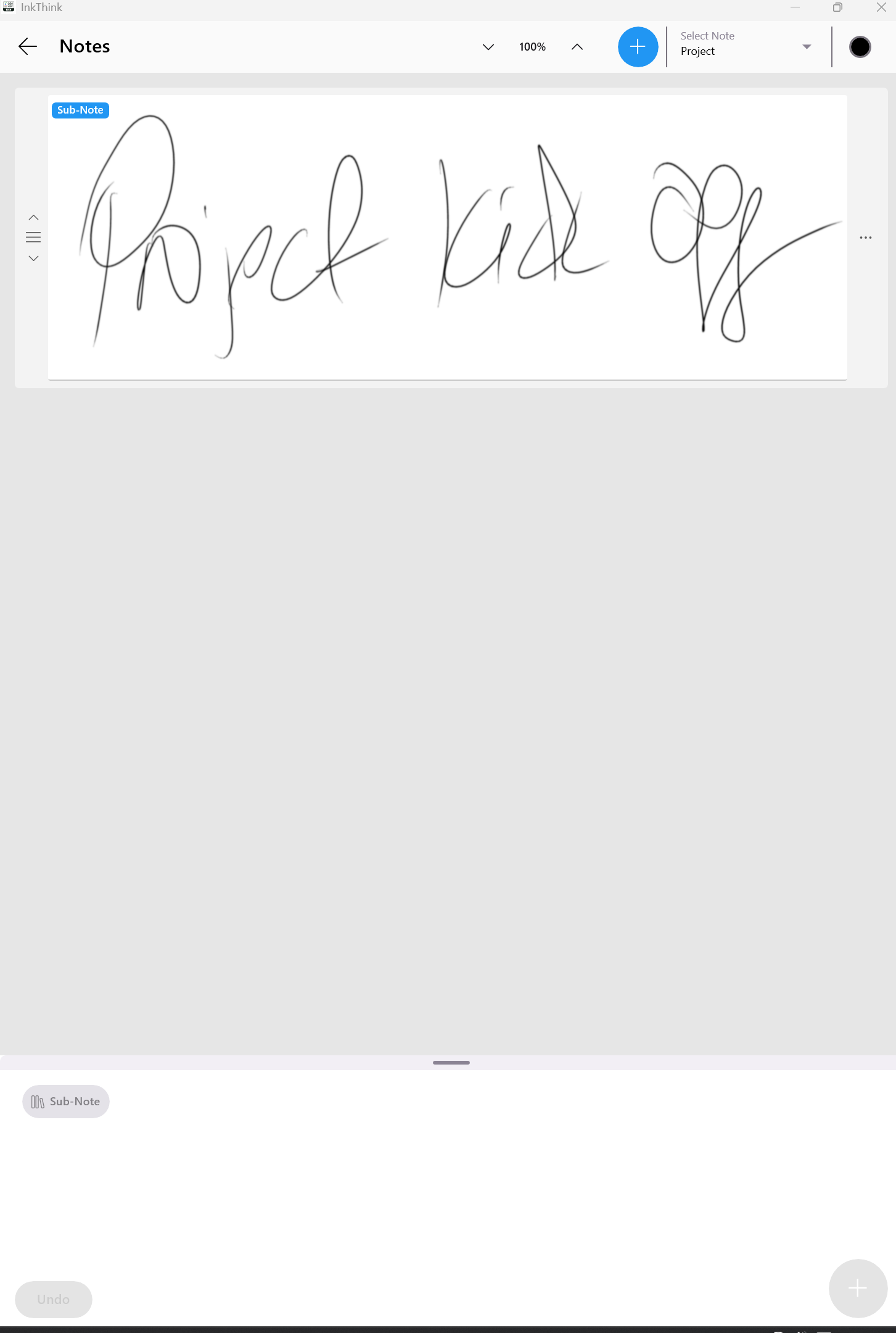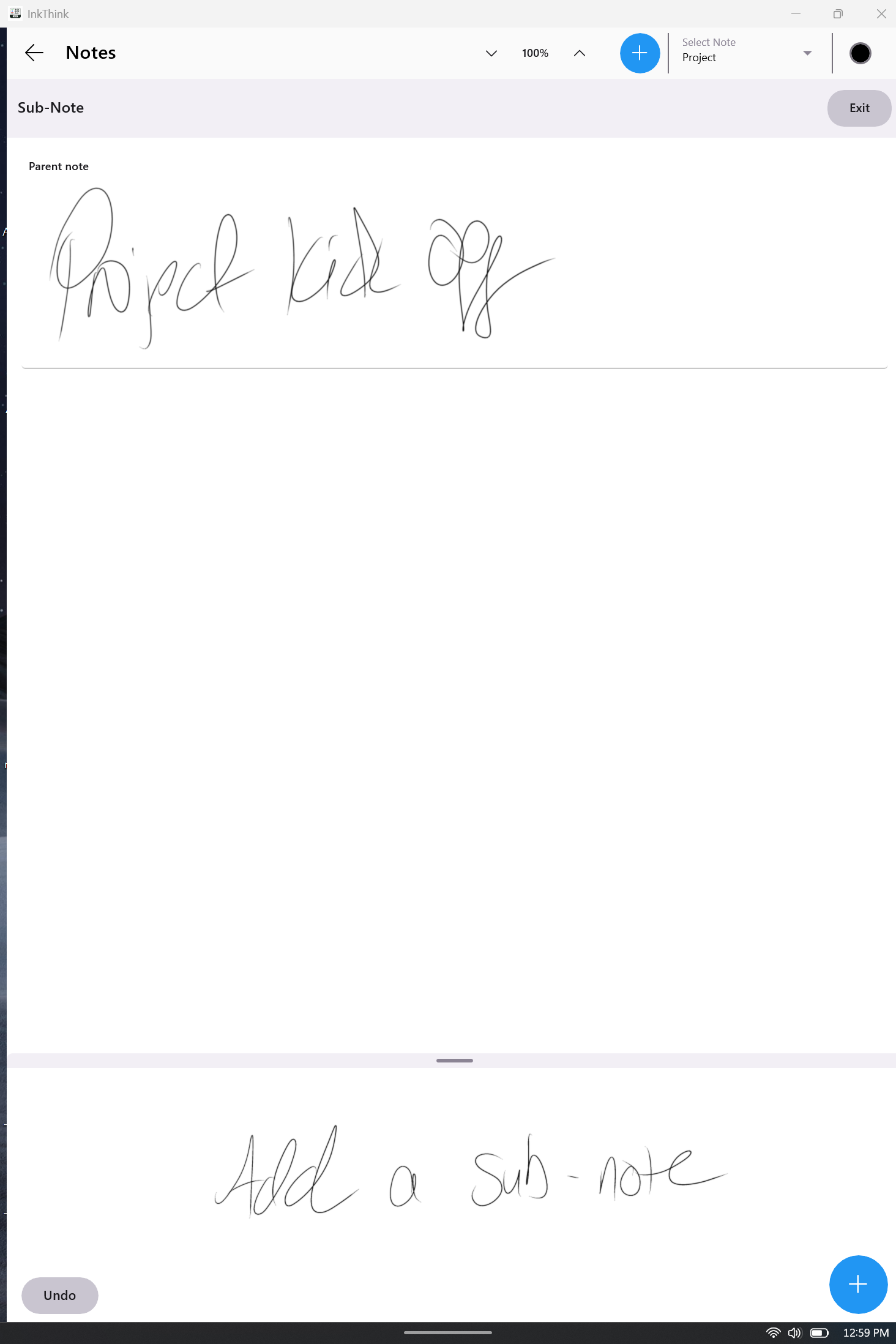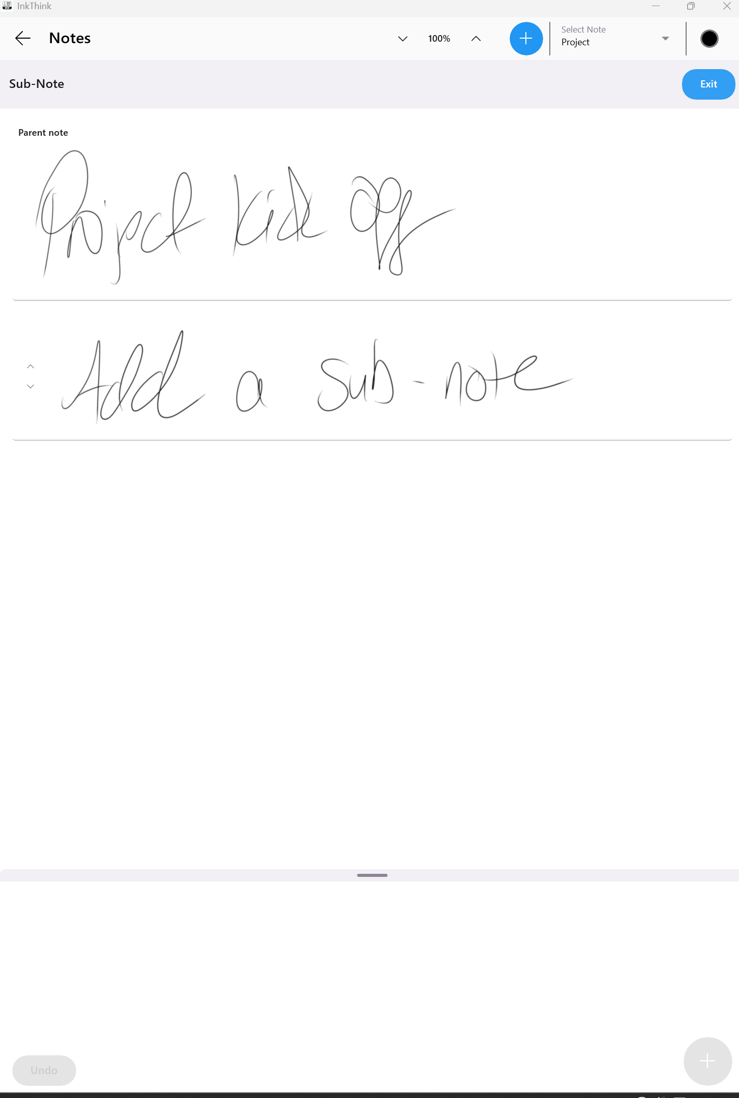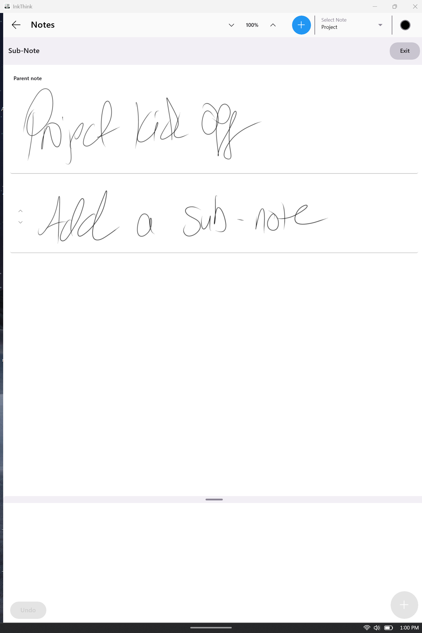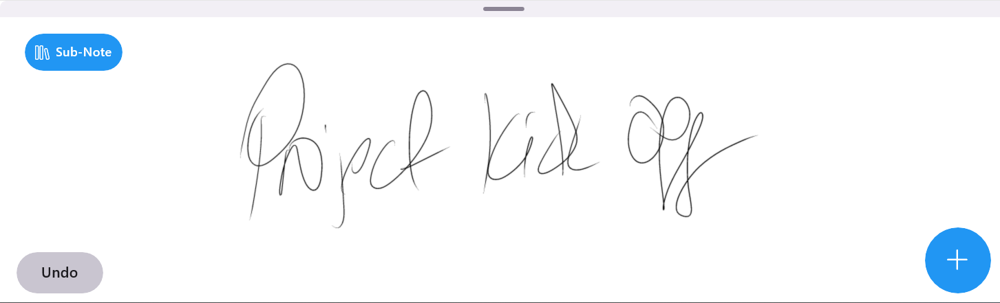For example, let's say I have a notebook group for a project. Each week we have a meeting. Now using the sub-notes function I can start inking my first note as normal. Unlike before, where I would just click the + button and starting inking my next note, I will instead click the 'Sub-Note' button on the left.
