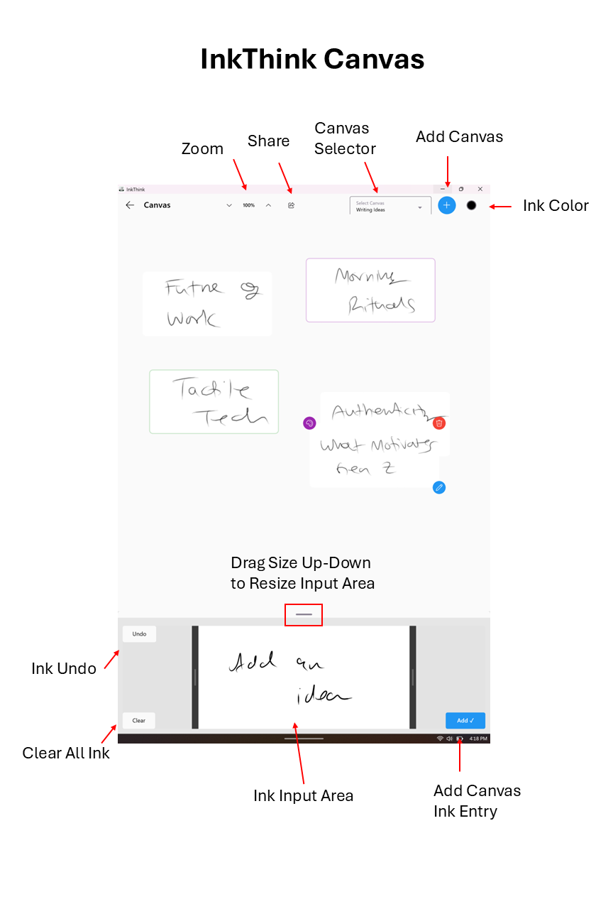Each of your Canvas 'ink' cards can be moved around like mini index cards. You can set a card boundary color, and also even share your canvas a PNG image.